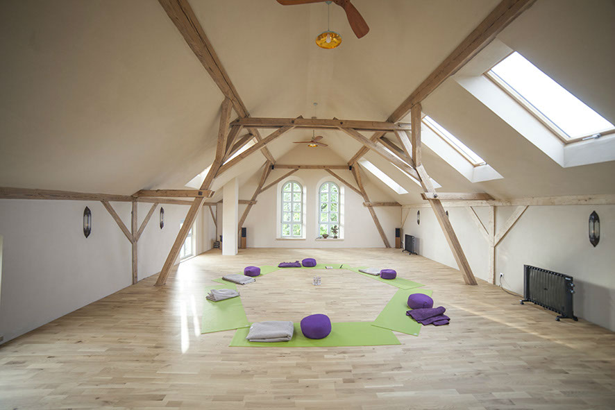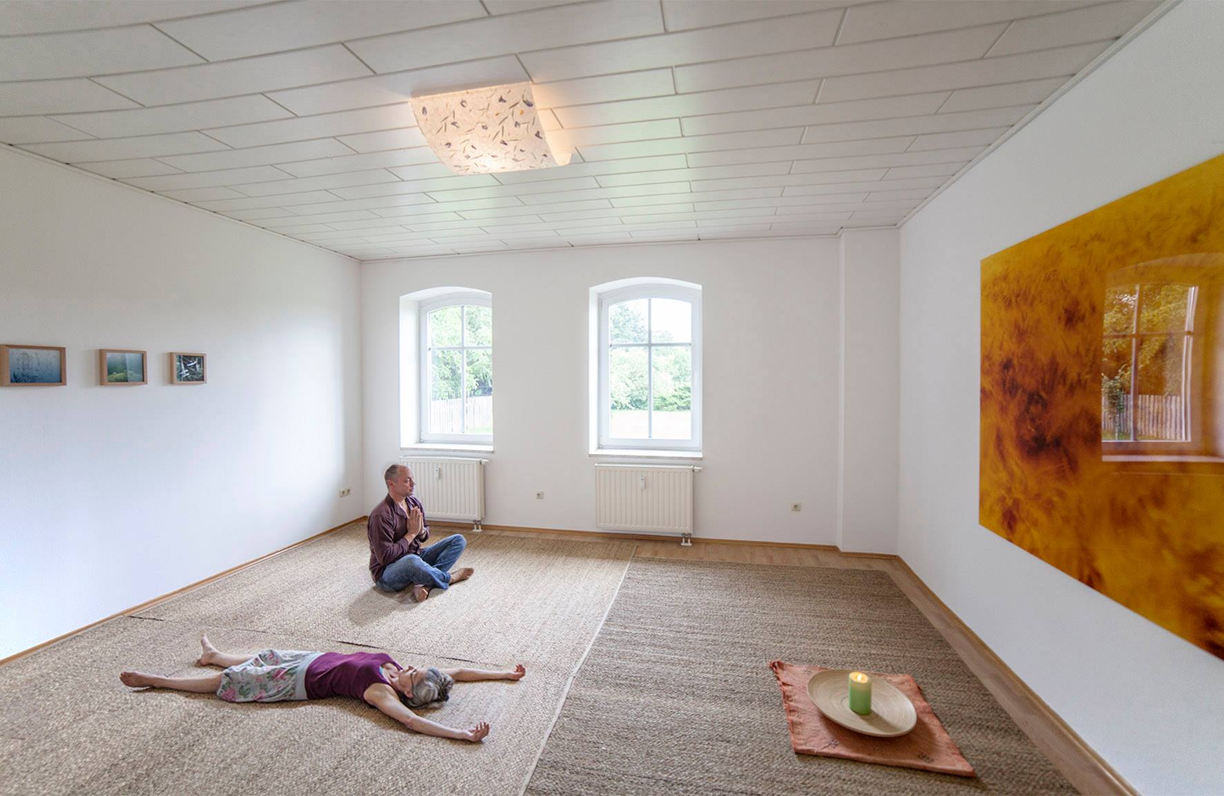 Der Meditationsraum ist ca. 24 m2 und zeichnet sich durch eine ganz besondere Klarheit aus. Hier kann man jederzeit abseits vom Seminarbetrieb seine Stille finden..