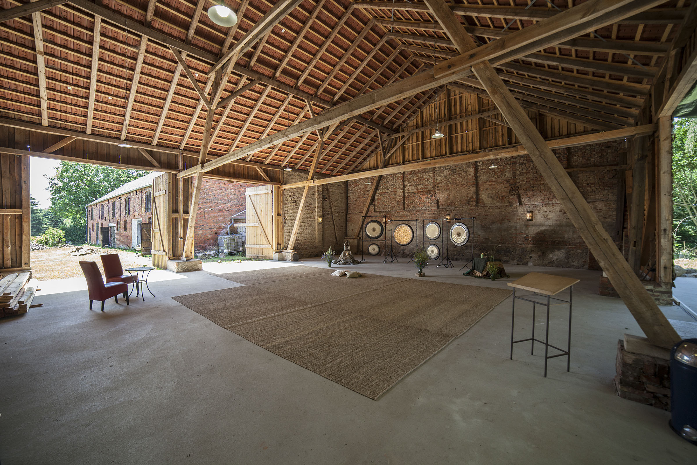 Wir nennen sie die Kathedralenscheune : unsere Veranstaltungsscheune hat großzügige, freie 225 m2, die großen Tore öffnen sich zur Terrasse im hintern Garten. Scheune und Terrasse bieten sich an für ein vielfältiges Workshopprogramm und Feierlichkeiten in einem sehr schönen Rahmen. Die Scheune ist nicht geheizt und deshalb nur von Mai bis Oktober nutzbar.