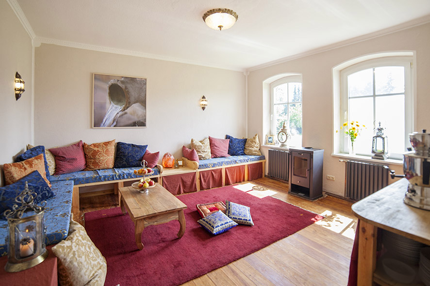 Unser Seminarraum ist lichtdurchflutet und hat eine Größe von 80 m2. Er ist in Lehmbauweise gebaut und hat eine Rundum-Wandheizung, was in der kalten Jahreszeit ein besonders angenehmes Raumklima schafft.