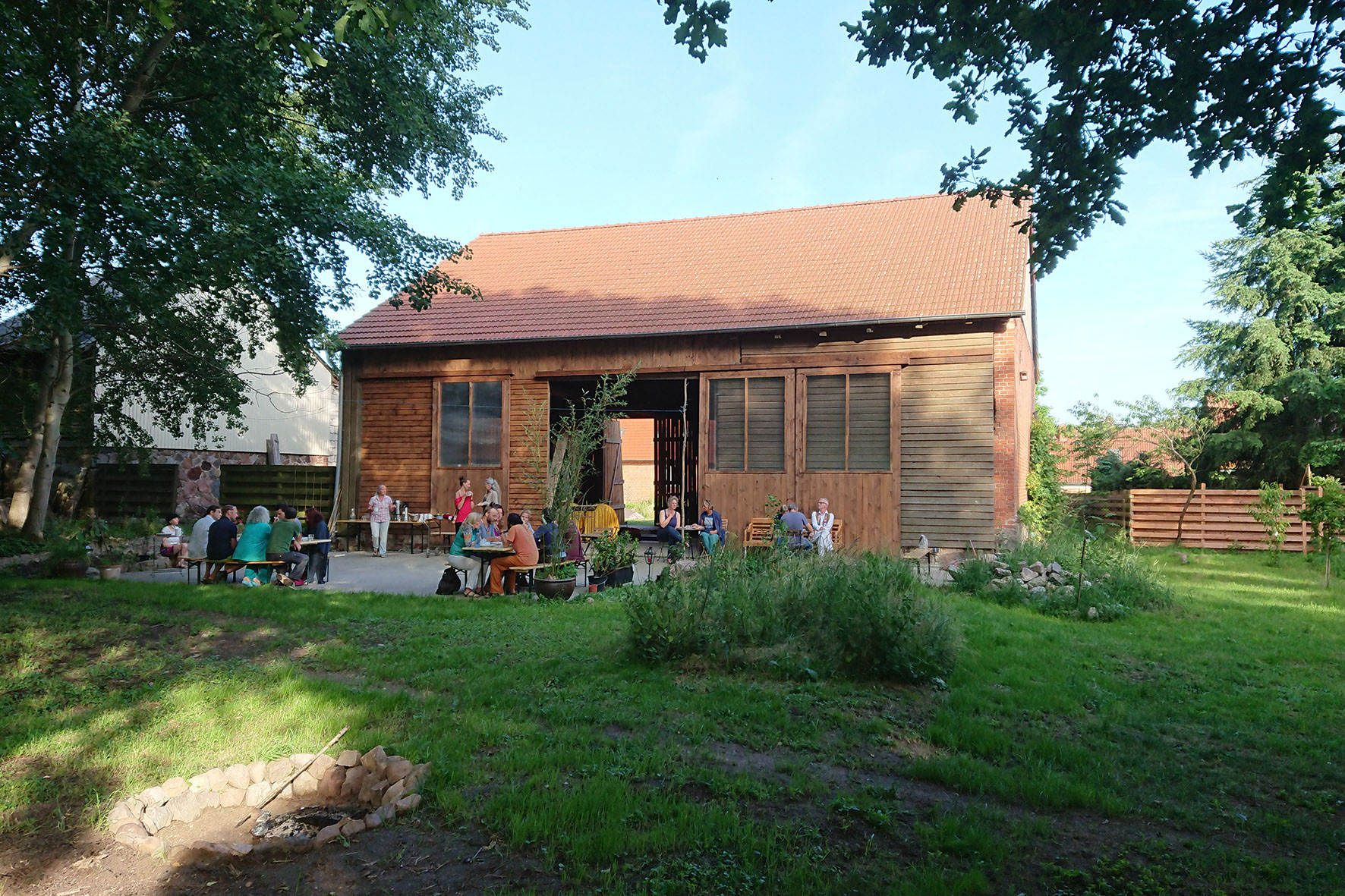 Wir nennen sie die Kathedralenscheune : unsere Veranstaltungsscheune hat großzügige, freie 225 m2, die großen Tore öffnen sich zur Terrasse im hintern Garten. Scheune und Terrasse bieten sich an für ein vielfältiges Workshopprogramm und Feierlichkeiten in einem sehr schönen Rahmen. Die Scheune ist nicht geheizt und deshalb nur von Mai bis Oktober nutzbar.